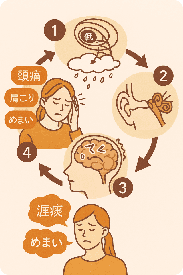 低気圧が近づいて気圧が急に下がると、内耳のセンサーがその変化を敏感にキャッチします。