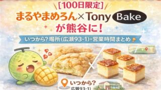 トレンド 【100日限定】まるやまめろん×Tony Bakeが熊谷に!いつから?場所(広瀬93-1)・営業時間まとめ 熊谷に「100日限定」のメロンパン屋さんが来ます。北海道・円山で人気の「まるやまめろん」と、話題の「Tony Bake」が組んだ 『100日だけの まるやまめろん by TonyBake in 埼玉熊谷店』。場所は熊谷市広瀬93-1で、1/... 2026.01.13 トレンド