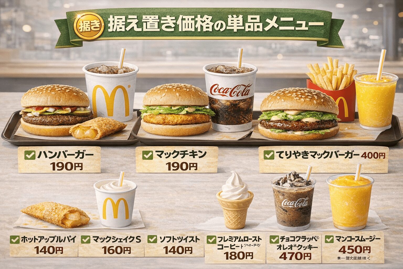 たとえば、ハンバーガー・マックチキン・てりやきマックバーガー、そしてセット500のような据え置き枠を先に頭に入れておくと、「今日はどれにする?」の時点で迷いにくくなります。